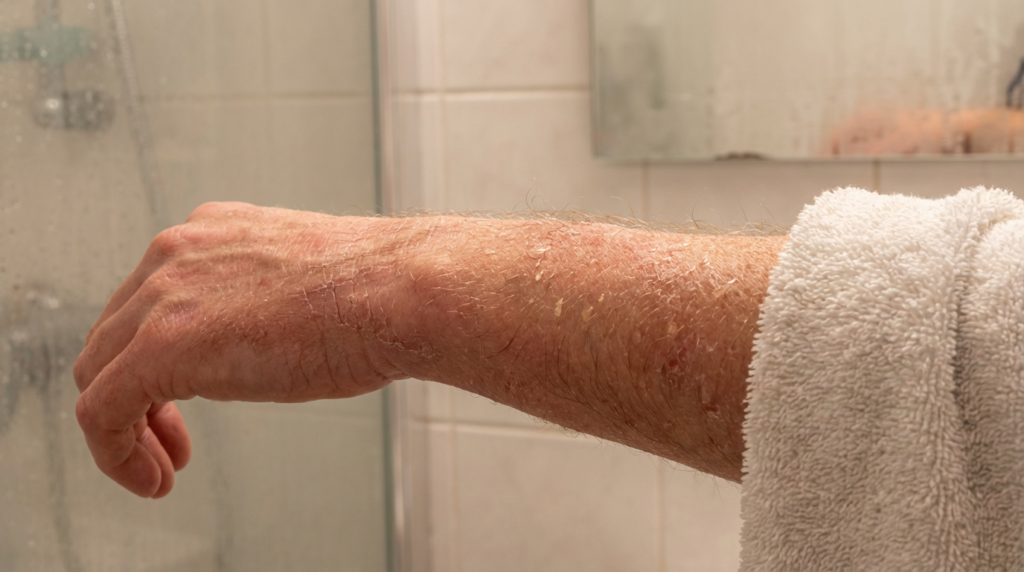- Неправильный уход – использование агрессивных мыл и гелей для душа с сульфатами разрушает защитный слой кожи, что усугубляет проблему сухости.